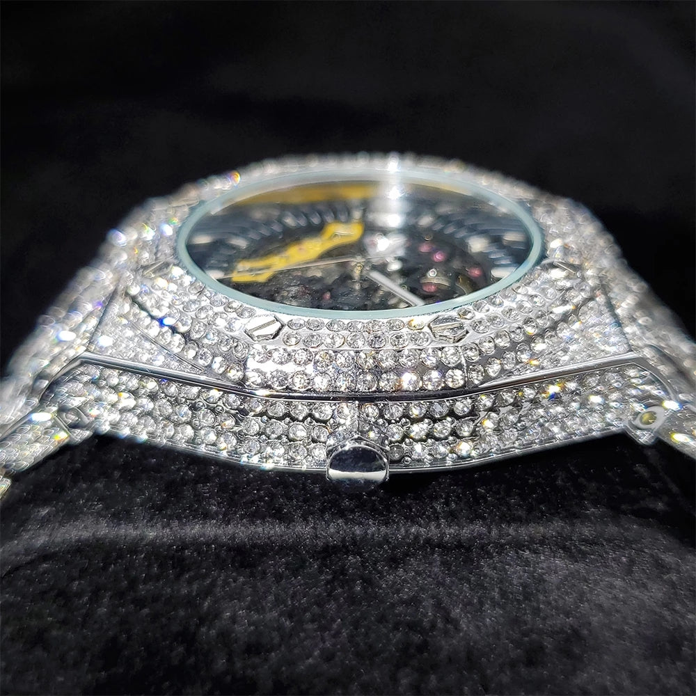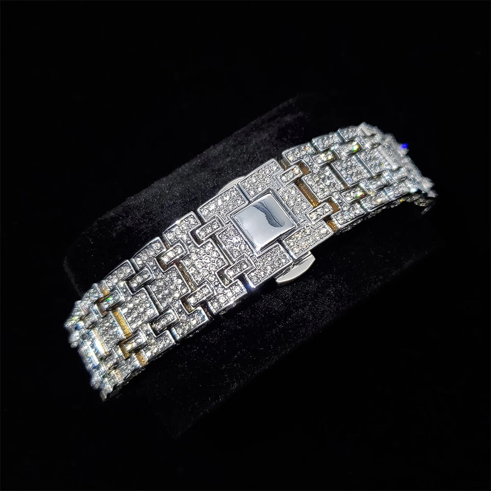 - Striking Appearance: Unisex, classic, fashion and luxury style, fully iced-out Gemstones decorated bezel, dial. Three parts Gemstones strap and some parts decorated beds strap. Transparent back cover.